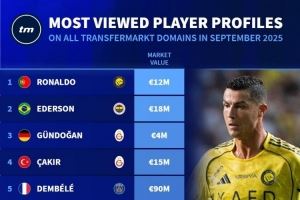 德转球员页面9月浏览量排名:C罗居首,埃德森第二、梅西第七